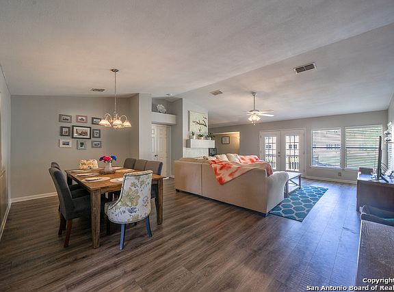 Check out this gorgeous open floor plan! This home has spacious rooms filled with natural light. You'll love the living room's vaulted ceilings & adjacent workspace. The large kitchen offers plenty of storage, breakfast nook, & granite countertops. French doors lead to the backyard & you'll love the mature trees! Fortune Ridge is move in ready with fresh paint, wood laminate in the living areas & carpet in the bedrooms. Schedule a showing today!