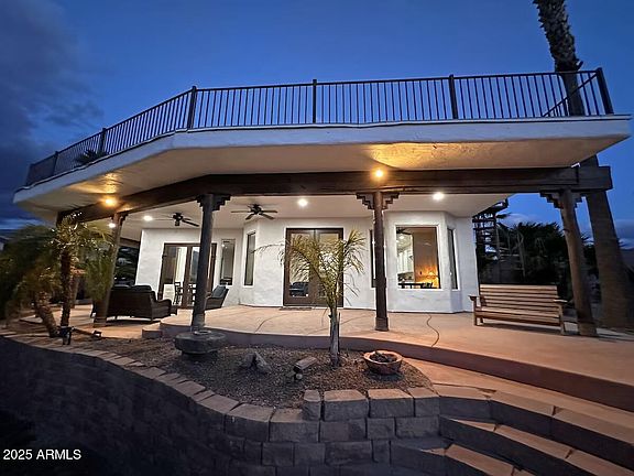 Luxurious Gated Riverfront Estate. Private beach, boat dock and launch ramp ideally located where the river widens for high & low-water boat launch. Extra-Wide 75' Foot Lot! Enjoy breathtaking river & mountain views across from gorgeous upscale estates. This remodeled 4-bed, 4-bath home boasts granite countertops, high ceilings, 36 inch doors, two fireplaces, and a tranquil owner's suite w/jacuzzi tub & walk-in closet. Relax on the back patio featuring a swim spa or ascend via spiral staircase to the rooftop deck. Owned Solar System & Water System. Expansive outbuildings 30 × 40 insulated A/C shop and a 36 × 40 plus a 15 x 9 pop out for full size RV bay + evap cooler. 1.1 Acre lot includes parcel east of Dike Rd.. Riverside Living at its Finest! Seller Financing Available