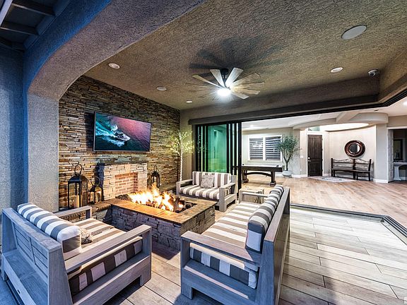 This wonderful one level home on nearly a third of an acre backs to an open space meadow with mountain views and access to miles of walking trails. The owners spared no expense when it comes to upgrades. Outdoor features include a waterfall into a spool, built in barbecue, custom pizza oven, trellis covered dining, putting green, storage shed and a covered seating area with fireplace and TV. The interiors are warm and contemporary with wood floors and sleek quartz counters., Listing includes a security system with cameras and surveillance. It also includes audio/visual with six mounted TVs (one outdoor TV) and built-in speakers in great room, family room and outdoor patio. The home can be sold completely furnished with decor mostly by Pottery Barn. As a resident of the gated community of Sorrento Trail at Bella Vista Ranch, you have access to the community clubhouse, pool, spa, fitness center, numerous walking trails, and are in close proximity to the Cyan Park.