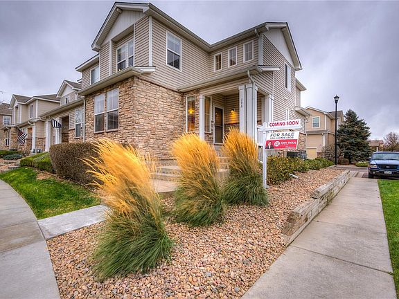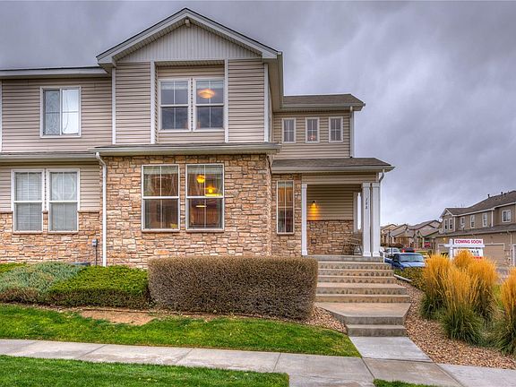 Cheerful Fronterra condo with low HOA fee that covers exterior maintenance, landscaping and snow removal. End unit, easily accessible, private, with a park front and raised porch. Main floor living and dining have upgraded vinyl and tile flooring, loads of light and a custom window bench for relaxing. Appliances included in the open kitchen. Spacious under stair closet with well placed storage racks and access to a huge crawl space for storage. Main floor has a half bathroom with utility closet and BRAND NEW 50 gallon water heater. Upstairs boasts two large master bedrooms with full bathrooms, linen closets and walk in closets. Open loft offers great flex space for third bedroom, office or gaming area. Unit is conveniently located near four guest parking spaces in addition to the oversized two car attached garage with loads of storage shelves and a workbench plus room for more storage with incredibly high ceilings. Convenient access to DIA and highways. Don't miss this adorable home!