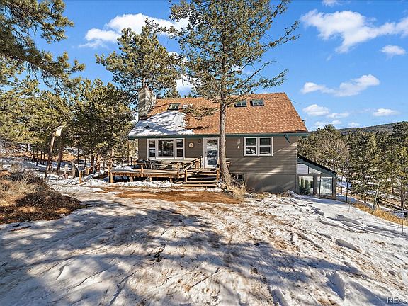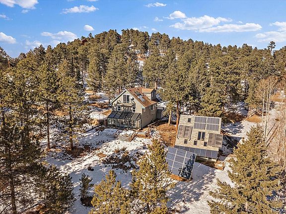 Opportunity awaits in Conifer Park Estates! Nestled on just over an acre, this property has tons to offer. So, what sets this one apart? The property is equipped with a seller OWNED integrated solar system for electricity and heat. The two car detached *HEATED* garage is perfect for all of your gear and mountain toys, and features an A-frame studio / work space above. The home’s primary suite is located on the upper level and features skylights in the bedroom and a private balcony. The primary bathroom boasts a walk-in shower, jetted tub, and walk-in closet. The main level holds the kitchen, living room with wood-burning stove, a full bathroom, and two bedrooms. The lower level offers a second living room featuring a cozy wood-burning stove, and is adjacent to a sunroom with floor-to-ceiling windows and amazing views. The lower level also includes a utility / laundry room with a toilet, utility sink, and shower head. The home features a spacious deck, amazing views, and abundant sunlight. Want the best of both worlds? The property’s unbeatable location off of Highways 285 and 73 provides easy access to shops, restaurants, and schools, but provides peace and quiet and true mountain living. Let your imagination run wild with this magical property! Visit https://revlmedia.com/9759-Fallen-Rock-Rd for more details and information. Sold AS-IS.