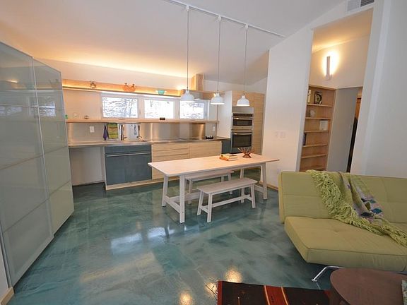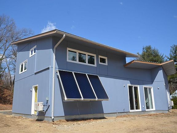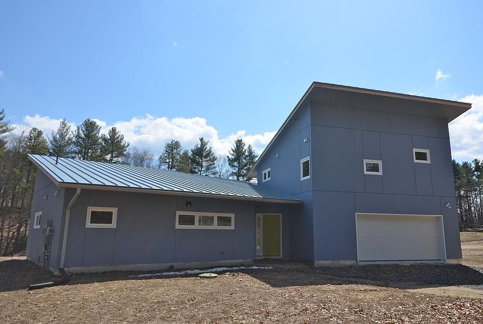 BRAND NEW CONSTRUCTION! The emphasis here is on extreme energy efficiency, natural light, passive solar with a flowing open floor plan perfect for gatherings. The expansive windows brings the outdoors in, there is a concrete floor with epoxy in a beautiful ocean tone, and the walls are efficient High R rated. This four bedroom Contemporary is complete with a first floor bedroom & bath, with three more bedrooms upstairs, including a master bedroom/bath and another full bath with combination tub/shower. Ceiling fans and interesting streamlined sconces add to the modern design. There is a bright and cheerful media space upstairs that could also be a perfect place to relax with a good book. Nice large two-car garage is a plus! Be a part of this cluster of energy efficient, GREEN Homes conveniently located near UMass, vibrant Amherst Town center and area schools.