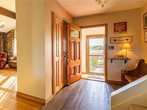 Spacious Contemporary hidden from road view. Garden entry offers several paths to front door. Generous foyer entry. Living room has wood stove with stone surround. Formal dining room. Kitchen completely remodeled, new Kraft Maid cabinets, Stainless Appliances, stone backsplash. Family room completely remodeled. Deck can be accessed from kitchen or family room. First floor laundry, first floor full bath. Second floor has Primary Bedroom with attached bath, Two bedrooms, Loft, Play room. Large windows in all living spaces. 2 car attached garage. Barn- 6 stalls for your favorite friends, 2 Run-Ins, Fenced Pastures, Spring fed Pond. 46.67 acres. (30 tillable), currently leased to farmer. Agricultural exemption currently on property.
