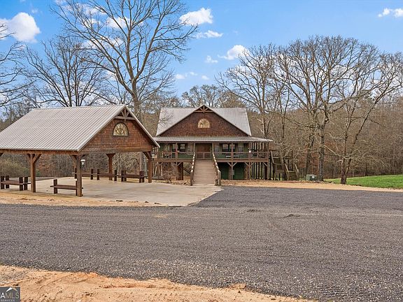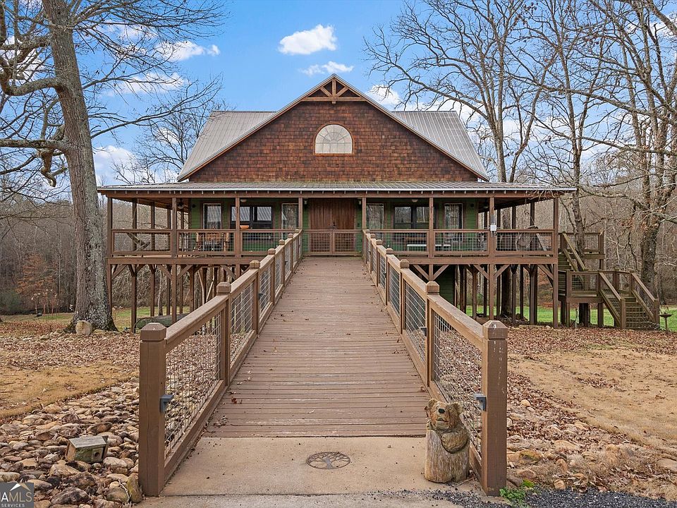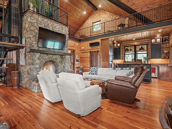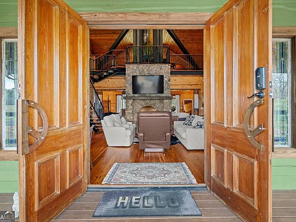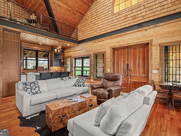 Built in 2019, this one-of-a-kind custom "treehouse" blends historic character with modern comfort. Featuring reclaimed heart pine floors throughout, pine walls and ceilings, and red oak accents including the fireplace mantle and sliding bedroom closet doors, the home is rich in craftsmanship and story. Architectural details include stained glass from an Alabama church built in the 1800s, additional stained glass and exterior elements from historic Vinings properties, and front doors reclaimed from a plantation home in Selma, Alabama. The kitchen showcases an original restored sink, walnut bar and island tops, and striking 1/4-inch reclaimed copper countertops. Refinished reclaimed tubs, an upstairs sink from the Jack Daniel's distillery, and reclaimed doors throughout add unmatched character. The porches are 56 x 16 and 24 x 40 wrap around porch and deck for a total of 1856 ft. for grand outdoor living and entertainment! Heated and cooled by four Mitsubishi zoned ductless units, the home also offers a drilled well producing approx. 17 GPM, a propane whole-house generator, prewiring for security, insulated pipes with heat tape, and a piano that conveys. A rare opportunity to own a thoughtfully curated, truly unique property.