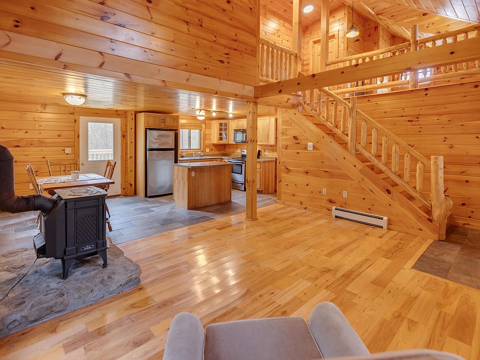 52 +- acres with Log Home in the midst of the White Mountains. Dreaming of your own Log Home surrounded by woods in the 'cool' town of Bethlehem... just a little off the beaten path but within 10 minutes of I-93, Bethlehem Downtown and Littleton? This may be "The One". Drilled well, 'U' shaped driveway, one + car garage under, metal roof. Built in 2006, the Expanded, Cape style home has hard wood and tile floors. Enter via a Full covered porch -- just the place for that morning 'cup of joe'. Welcome into the warm and inviting living room enhanced with cathedral ceiling and custom stone hearth with wood stove. Open concept space includes the dining area and efficient kitchen with island. Perfect for one level living -- full bath (including laundry hookups) and bedroom complete the first floor. Upstairs, two bedrooms, full bath and loft. Walkout basement is currently set up to accommodate a one car garage with ample storage space. Bring your ideas to renovate this level to increase living space; perfect for a family / gathering space! 'Just finished' back deck overlooking the peaceful woods. With cutting, there is the possibility of a Westerly sunset view. Imagine exploring your own forest complete with the remnants of stone walls and streams. This mountain home is within 20 minutes of Cannon Mt (Franconia Notch State Park), 25 minutes to Crawford Notch/ Bretton Woods Ski Area.