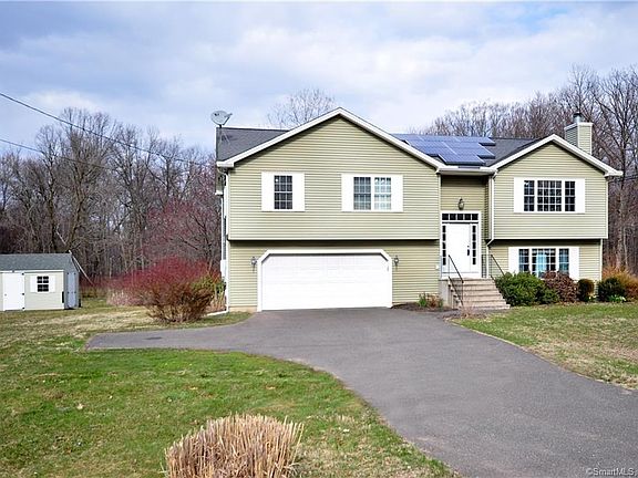 Retreat from the hustle and bustle of life to this 3 bedroom, 2 1/2 bath Raised Ranch that is proudly perched on a nice lot The interior features soaring ceilings, open floor plan, walk-in closets, plush carpets, hardwood floors that lure you from room to the next, updated light fixtures and a family room in the finished lower level. This lower level offers a half bathroom, laundry room and glass slider walkout. Additional access to this lower level is from your over-size garage or from your level backyard. Your choice of either upper level deck with views as far as the eye can see or lower covered patio to enjoy while watching the New England seasons change. Sit back and relax on a long summer night as your guests frolic with friends in your spacious yard that is professionally landscaped and extends front to back. As if this home isn't already perfect for your needs, it also saves you money with its many solar panels Don't miss this great opportunity have your piece of the American dream Nothing to do but move into this home and enjoy.