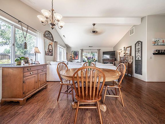 Beautiful single-level home in established cul-de-sac neighborhood with vaulted open-concept dining and living room which open to a tranquil backyard oasis. Covered patio and deck, grass lawns, mature landscaping, garden beds, and covered hot tub area accessed via french doors from spacious master with walk-in closet and en-suite bath. Two additional bedrooms and full bath with skylight and tub/shower combo. Efficient kitchen layout with solid surface counters, eating bar, dishwasher, refrigerator, and range oven. Other amenities include a tiled entry, laminate plank flooring, ceiling fan, laundry room, two-car garage, and nice backyard storage shed.