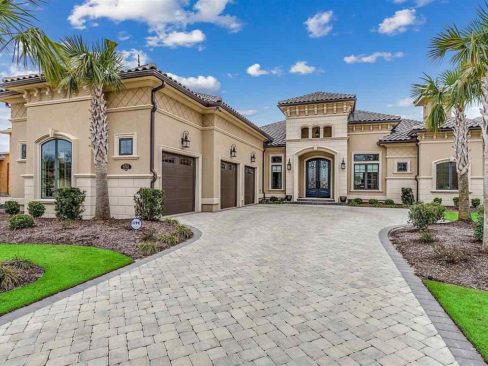 Don't miss this amazing opportunity to own one of the newest Mediterranean masterpieces on the INTRACOASTAL WATERWAY in the highly exclusive gated community of Members Club at Grande Dunes. This 4 bed 3 full and 1 half bath home with a 3 car garage was completed in 2019. The 3400 sq ft floor plan with soaring 10’ sliders that open to the enclosed pool area make it one of the best for entertaining. The gourmet kitchen features custom cabinets, subway tile, granite counters, large work island with sink and appointed with top of the line stainless steel appliances. The kitchen also features a wet bar with a separate wine fridge. The living room features soaring trey ceilings and oversized sliding doors that allow for abundance of natural light and gorgeous waterway views entering the home through the foyer. The enormous master suite features trey ceilings, sitting area, two walk-in closets with custom shelving. The en-suite bath features dual vanity granite sinks with oversize tub with large walk in tile shower. The three remaining bed rooms are on the opposite side of the home. The office has custom wood paneling and built ins. Hardwood floors flow throughout the common areas and master suite with carpet in the remaining bedrooms and tile in all baths and laundry room. The backyard has a gorgeous screened in pool/spa, built in gas grill and fireplace with tv making for a great day of entertaining. Other features are 3 zone HVAC system, generous walk up storage above the garage, blue tooth enabled recirculating tankless hot water heater, outside storage. This property is located in South Carolina’s premier coastal community in Myrtle Beach; Grande Dunes. Stretching from the Ocean to the Carolina Bays Preserve, this 2200 acre development is amenity-rich and filled with lifestyle opportunities unrivaled in the market. Owners at Grande Dunes enjoy a 25,000 square foot Ocean Club that boasts exquisite dining, oceanfront pools with food & beverage service, along with meeting rooms and fun activities. Additionally, the community has two 18-hole golf courses, including the area’s only truly private course designed by Nick Price, along with several on-site restaurants, deep water marina, Har-tru tennis facility and miles or biking/walking trails! For the most actuate information and floor plans please contact the listing agent.