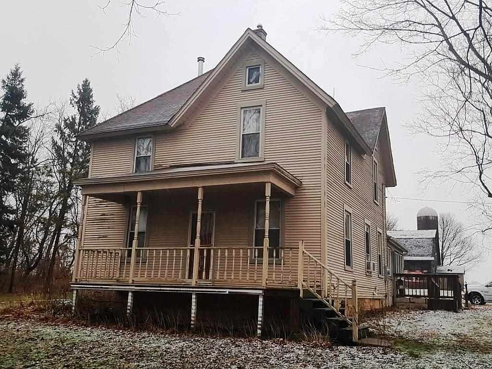 Opportunity knocks. 5 acre farmette, views for miles in all directions, quaint setting, Hononegah schools . Homes exterior needs TLC . The main floor offers huge rooms , hardwood, original doors, 2 sets of french doors, wide trim, high ceilings , clawfoot tub, main floor laundry room and big eat in kitchen . The second floor has 3 bedrooms , a large sitting area / library with wood stove and a full bath w/ shower. The third story / attic would be a fun area to finish off. There is a 2 car vinyl sided detached garage w/ concrete floor and 220 amp service. There is square , usable and basically sound dairy barn on the property , it appears to be just a steel roof and siding away from another 50+ years of service. Propane furnace and stove.Cash or conventional Buyers only.