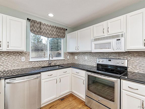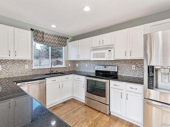 Welcome home and appreciate all this house has to offer. New exterior paint last year means enjoying barbeques in your backyard this year. Step into the front foyer to wood floors throughout the main floor. Upgrades include granite countertops in the kitchen with a custom tiled backsplash. Stainless Steel appliances are included. A new Maytag stainless steel microwave oven is being delivered on 3/29 and will be installed accordingly, included with sale of home. One feature to not overlook is the large walk in kitchen pantry. The sliding patio door leads to a maintenance free composite deck you'll find endless uses for so enjoy as Spring has arrived and Summer gatherings are right around the corner. The upper primary suite has an updated bath with vanity, granite vanity top, lighting and mirror. There are two additional bedrooms and a full hallway bath on the upper level as well. Use the finished basement as a 4th bedroom as it also has its own attached bathroom or is perfect for a family room too. Lower level laundry. Walk to Valor Christian High. Starbucks, cafes and markets just minutes away - easy walk or bike ride. The Sellers have taken very good care of this house. Come and see for yourself!