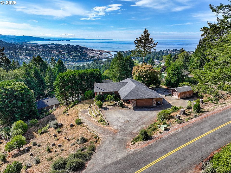 Million dollar views from almost every room! Bring your vision and make this big sturdy home all that it can be! On the main level is the kitchen, dining area, a huge living room with doors to an enormous entertaining deck, the owners suite with huge bath w/ tub, separate shower and double sinks, and a laundry room with a half bath. On the lower level are 3 bedrooms, a full bathroom and a bonus 528 sq ft flex space area with a roll up door that can be reached by car from outside, ideal for a shop or game room. There is a 2 car attached garage plus a detached shop/garage building and an RV pad with full hookups. The huge entertaining deck has an adjacent cement firepit patio with gorgeous ocean views. On the extra large, private .59 acre property are Magnificent maple trees and terraced gardens. The roof is new as of 2022. Hardy plank siding. Heavy duty construction with windows to the sea in almost every room. Priced to accommodate your personalized vision.