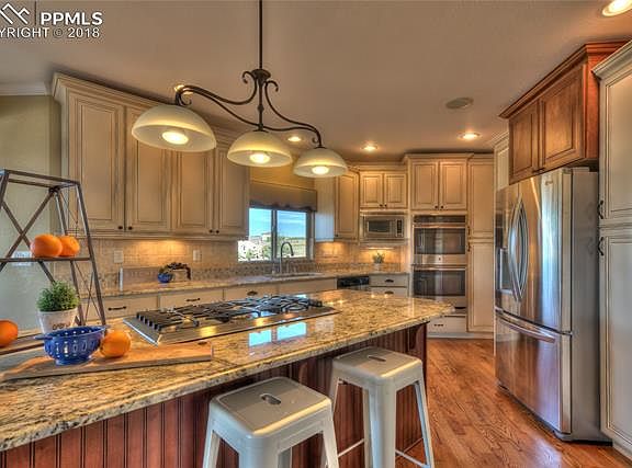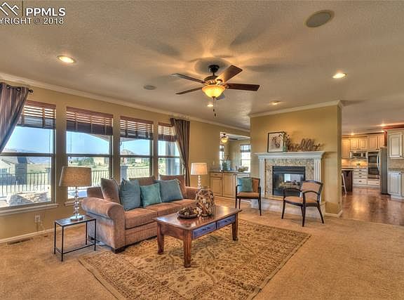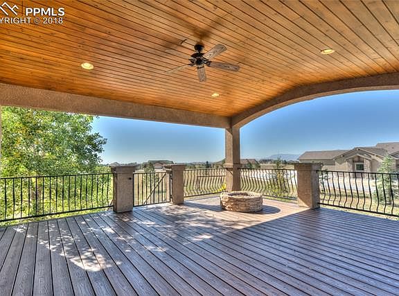 Beautiful stucco home on close-in 2.5 acres! Views from Pikes Peak all the way down to the Sangre de Cristo mountains. Tremendous square footage (5315sf) means HUGE rooms for your family to enjoy! 2 sided fireplace between the living room & kitchen. Main level office with French doors. The spacious eat-in kitchen (23x32) includes hardwood floors, quartz countertops, gas cooktop, double oven, and stainless steel appliances. 18x23 master bedroom has a gigantic 5 piece bath, and a sitting room/office/nursery. All upper level bedrooms all have a private bath, or access to a jack & jill bath with quartz countertops in each one. Unbelievable covered deck with ceiling fan & views. Walkout basement to a stamped concrete patio. Amenities & upgrades all over including 2 furnaces 2012 for warmth & efficiency, central air, ceiling fans, home theater room, on demand water heater 2015 (also plumbed for second water heater), radon system, security system, and fully finished 3 car garage