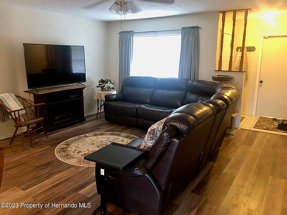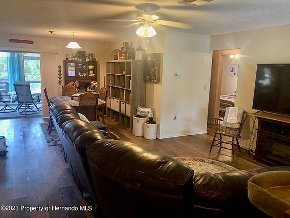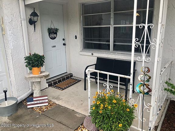 Active with contract, taking back up offers only. Charming 3/2/2 home with hot tub is ready for it's new owner! Covered front porch keeps you dry as you enter your next home. Newer wood laminate flooring in the living and dining rooms, plus ceiling fan. Kitchen features breakfast bar, pantry, tile floor, double sink, glass top range with newer range hood, dishwasher with transferrable warranty, and microwave oven. Dining room has sliders to the lanai and an attractive wall unit that stays. Master bedroom has walk in closet and wood laminate floor, with tiled floor and shower in master bath. Split plan home, with both guest bedrooms featuring carpet, ceiling fans, and good sized closets. Guest bathroom has tile floor and combo tub/shower, featuring a newer vanity and chair height toliet. Washer, dryer, and small freezer in garage will convey. The lanai is a great place to relax, with an inground hot tub for 6 people. Enjoy soaking up the Florida sunshine or grilling on the outside paver patio. There is also a concrete pad that you could put a shed on if you wish. The back yard is fully fenced. Septic system just pumped! Roof new in 2020. The sellers love the quiet location, so convenient to the stores and restaurants, just a few minute drive to ''4 corners''. Come see this lovely home today!