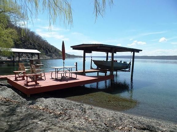 Seasonal ranch style cottage has much to offer. Approximately 90' of deep, level beach front, both covered and open decks, plenty of parking area, well with water purification system, cathedral ceiling with skylights in the main living area, deep closet space, 2 storage/utility buildings. Located on the east side of Seneca lake this property offers many beautiful sunsets to be enjoyed. Only 12 miles from the quaint village of Watkins Glen. Property to the north is part of the forever wild program & cannot be developed. This is a unique property for Seneca Lake. Please note that this is a seasonal property and the lake road is 4 wheel drive. Please Call for an appt. 607-738-7195.