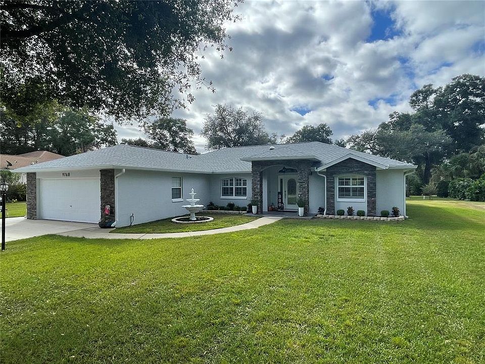 THINK ELEGANT! ABSOLUTELY BEAUTIFUL INSIDE AND OUT, and FABULOUS LANDSCAPING LOCATED IN RAINBOW SPRINGS COUNTRY CLUB. No detail was overlooked in the remodel of this one-of-a-kind residence including a brand new roof in August of '22. Enter the home through a covered front porch with impressive stone pillars, elegant lighting and a captivating front door with a custom designed glass with a keyless entry. Home boasts upgrades, upgrades & more upgrades. Beautiful Vinyl flooring greets you at the door with huge vaulted ceilings, highlighted by the 72” fan that brings out the true comfort of this home. Dining room is perfectly positioned with a modern light fixture to accompany a relaxing dinner. Living room is very spacious with LED lighting and two solar tubes with remote controls. The immaculate kitchen is a must see that showcases granite countertops, soft close cabinetry with custom crown molding, bar seating, all GE appliances including a double oven electric range with a self-cleaning convection oven. The spacious master suite offers privacy and serenity. The master bathroom can be described with one word which is stunning. Separate luxurious shower with multiple shower heads, walls tiled all the way to the top with built in glass shelves! Perfectly positioned in the center of the bathroom is a gorgeous whirlpool spa tub. The bathroom is complete with marble flooring, and quartz countertops with dual sinks and recessed lighting throughout. Over on the opposite side of the house, sits two more bedrooms with brand new ceiling fans and carpet. The second bathroom has granite counter tops with a frameless glass door to the shower/tub combo. The house offers many other upgrades including an extended driveway, and a 33x14 foot lanai with an insulated roof. The home is waiting for you to make it yours!