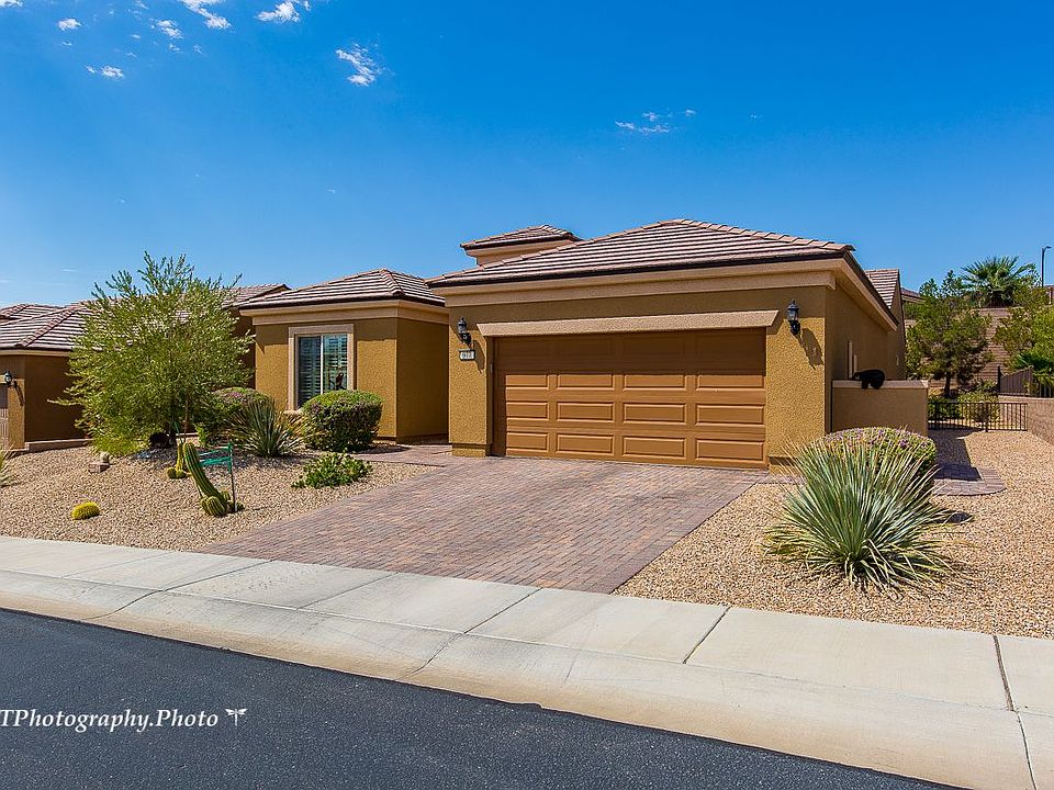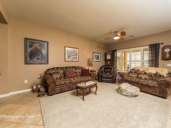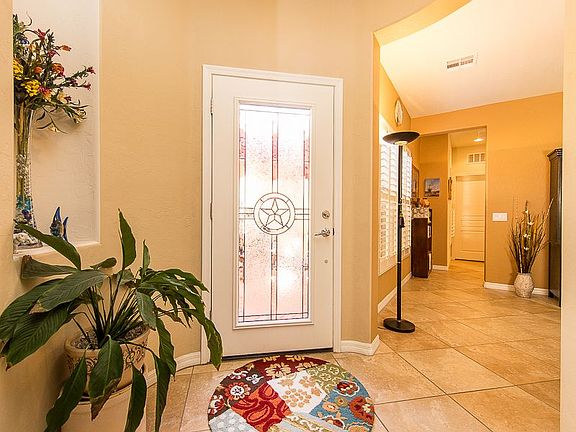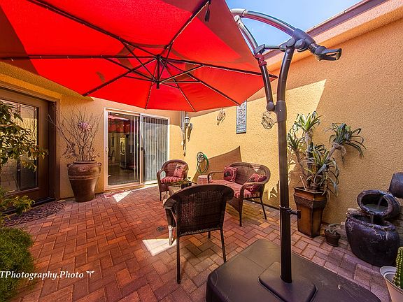 This Overland Trail beauty is like an oasis in the desert! You can see the quality of updates upon entering through the interior, gated courtyard to the upgraded front door. Brick pavers in driveway, courtyard and rear patio. Tiled flooring on the diagonal, granite counters, 2 1/2 car garage with lots of added storage and extra lighting, plantation shutters throughout, built-in entertainment center, privacy screen and extended patio cover in rear along with a fully fenced backyard. Extensive landscaping and two waterfall fountains included. All appliances plus washer/dryer and refrigerator stay. A MUST SEE HOME!!