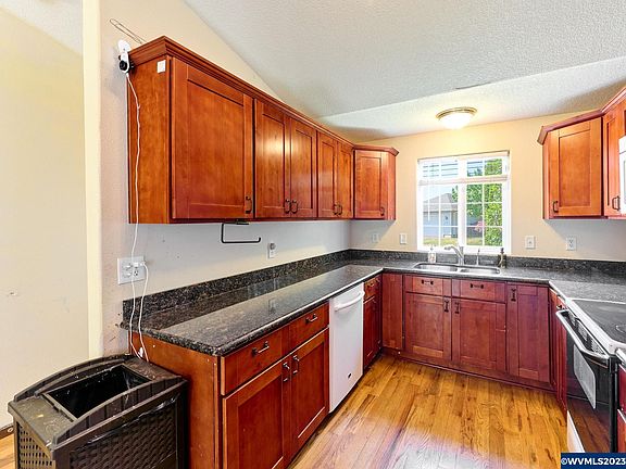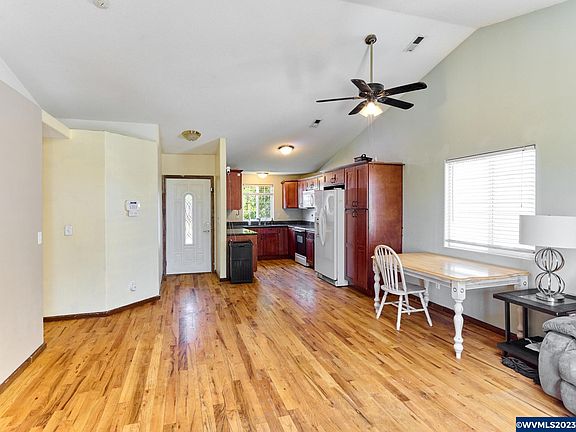 Only farmland behind this great single level 4 bedroom, 2 bath home. Beautiful Oak Hardwood floors. Granite counters in kitchen and baths. Vaulted ceiling in living room, dining and kitchen. Heat pump for efficient heating and cooling! Fully fenced backyard with storage building off the patio. Less than 2 miles from new Amazon office in Woodburn. This won't last long!