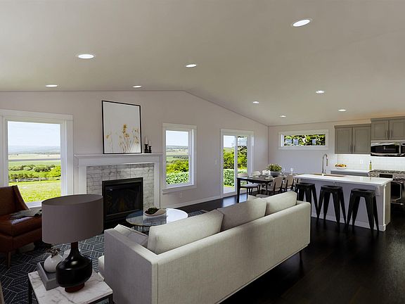 The 1395 square foot Darrington combines luxury and space in a two-story home plan. The first floor features an expansive living room and adjoining dining room, both overlooked by an open kitchen that offers ample counter space and cupboard storage. Upstairs, the laundry room is conveniently located next to the bedrooms. The main suite has a bathroom with stand-up shower and glass enclosure.