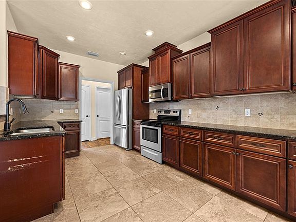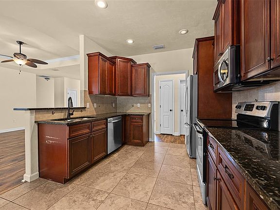 Under contract-accepting backup offers. Welcome to this beautiful 4-bedroom, 2-bath home featuring brand-new interior paint and fresh carpet in all bedrooms. The main living areas offer durable vinyl plank and tile flooring, perfect for low-maintenance living. Enjoy a spacious layout with a split floor plan that provides added privacy. The kitchen is complete with granite countertops, stainless steel appliances, and wood cabinets with elegant crown molding—ideal for anyone who loves to cook or entertain. The large, fully fenced backyard is perfect for outdoor activities and includes a charming brick fireplace—great for gatherings or relaxing evenings. A screened-in patio offers additional outdoor living space to enjoy year-round. The spacious master bedroom features a generous walk-in closet, while the master bathroom is equipped with dual sinks, a soaking tub, and a walk-in shower for ultimate comfort. Located in a quiet neighborhood with NO HOA, this home delivers both convenience and freedom. Move-in ready and full of desirable features—don’t miss it!