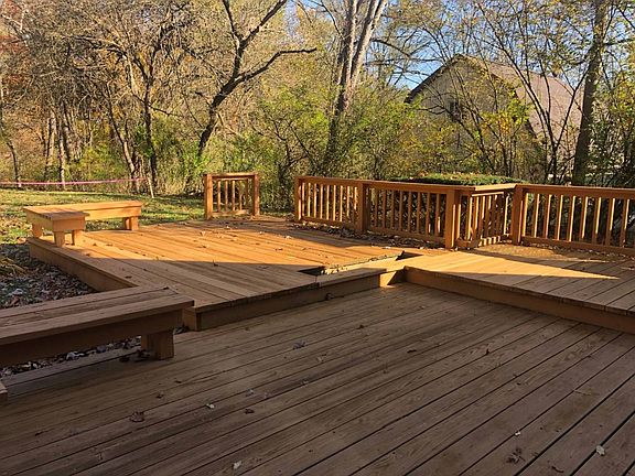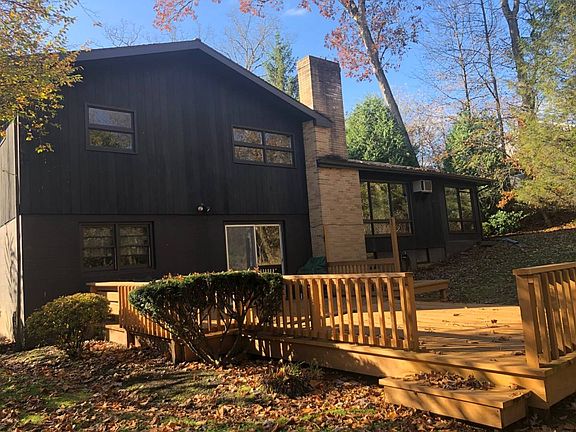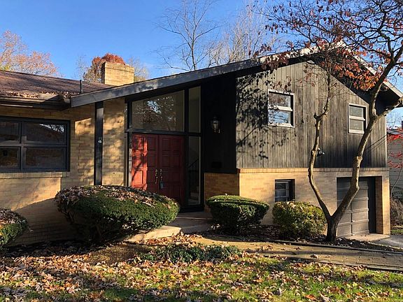Welcome home in this airy and bright split level in Parkview Heights. This lovely home is located on a quiet street with its back to a wooded area. The cathedral ceilings and glass make for a dramatic entry, with the Cherry stained double doors and chandelier beckoning you in. The cathedral ceilings lead from the foyer into a large living room with wood-burning fireplace and a wall of windows facing the back yard. The ceiling and wood beams lead then into the "dining room" addition where the windows continue in addition to two sliders onto the brick patio. The dining or living rooms circle back into the eat in kitchen then back into the foyer. Stained steps lead up and down from there. Down leads into a family room with attached half bath with a stack-able washer/dryer. The basement, garage and the back deck are also accessed from the family room. At the top of the stairs up is the full bath and then the bedrooms. The master bedroom has an attached half bath. Home features plenty of storage with lots of closet space and an unfinished lower level. The ceilings in the basement are high enough to finish to add additional living space. The 1/4 acre lot has mature trees and a flat back yard.