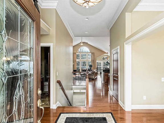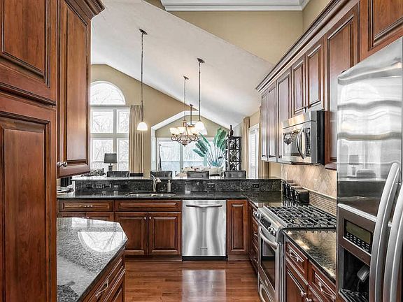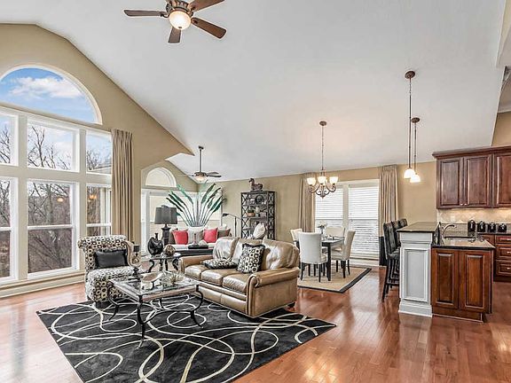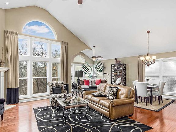PRICE REDUCED Open Sun 9/30 2-4 This beautiful Bob Webb 3 bdrm, 3 ba condo located in the Village at the Bluffs is the only free standing unit in the complex. It boosts of a covered entrance with a leaded glass door, side lights and transom window. The foyer offers a spectacular view of the great room with its massive windows and breathtaking views of the treed ravine. A charming dining room w 12 ft ceilings is adorned with beautiful crown molding an access to the well appointed kitchen with 42''cherry cabinets, granite counter tops, stainless steel appliances and a raised counter that looks out into the great room. The homes lower level presents another living area including family room, wet bar, third bedroom, full bath and office creating approximately 3,385sq ft
