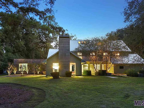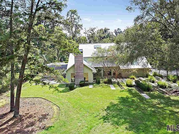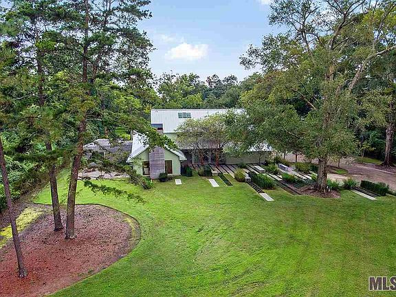 Serenity and privacy on 4.2 acres on historic Highland Road! Once featured in Dwell Magazine, this contemporary beauty has everything imaginable plus 5 spacious bedrooms! The home was completely remodeled four years ago creating a clean, contemporary feel. The dramatic foyer is lit by natural light from the skylight above the stainless staircase leading to the spacious living room with wall of windows, fireplace and wet bar with fridge and ice maker. The kitchen features top of the line stainless appliances, quartz counters and clean lines. A bank of sliding glass doors offers a breathtaking view of the rear property and stocked private pond. Master suite is over 1000 square feet. The master bath has a free standing tub filled by overhead rainfall feature. Shower is surrounded by frameless glass and views the outdoor shower in a private courtyard. Walk through master closet has ample storage along with a mirrored vanity. There is an additional bedroom suite off the kitchen area. Upstairs has three large bedrooms, 2 baths and a study with a large landing area that leads to a deep balcony overlooking the property. There is an outdoor kitchen and gas fire pit, a barn, chicken coop and bee farm. The pond is stocked with fish and there is plenty of land to explore. The home has a lifetime metal roof, full house generator, 3 recently installed AC units. Flooring is wood and porcelain tile in wet areas, no carpet anywhere. Utility room has wine fridge and mobile island with quartz counters. Located between Staring and Bluebonnet, 10 minutes from LSU and convenient to retail, medical and restaurants.