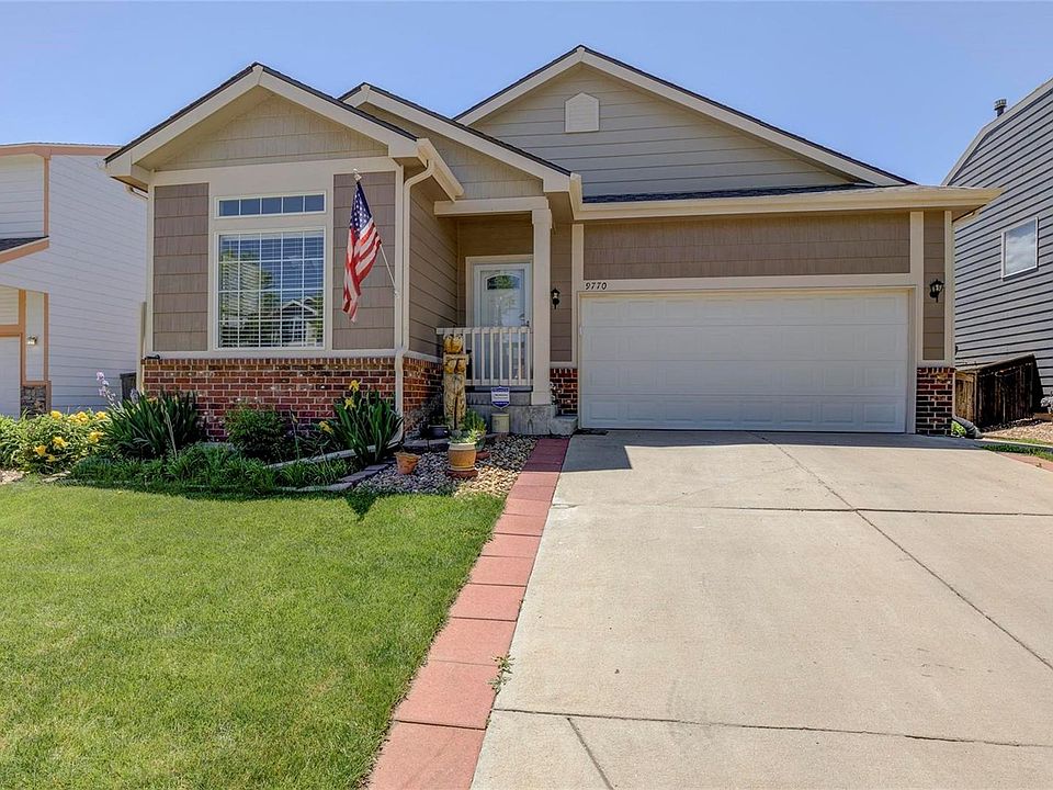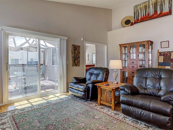 Like new condition, ranch home in popular Eagle Creek Community. Open floor plan, real oak floors throughout main floor, gorgeous kitchen & wonderful master suite. Kitchen features beautiful granite counters, quality cabinets, newer matching black appliances & pantry. Master features oversize attractive shower & walk-in closet with custom shelving. Vaulted great room, spacious & inviting, light & bright, & features attractive gas fireplace. Spare bedrooms are a generous size. Main floor laundry room is convenient to main floor bedrooms. Large basement bedroom features egress window. Spacious family room includes rough-in for future 3rd bath. Central AC, water softener & water purifier included. Quality security system available--currently installed--smart phone operated with life alert. Sunny deck with pergola cover & gas line for grill. Sprinkler system installed. New Roof. Community playground nearby. Convenient location, DIA 13 miles, super market & new community center 3 miles.