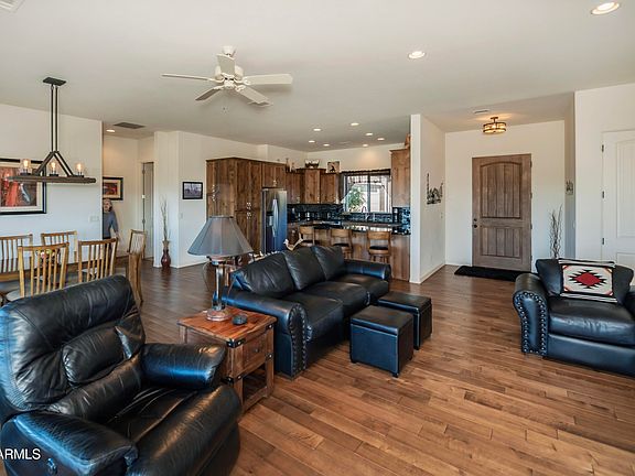 Nestled in the heart of Legend Hills, Prescott Valley, this 2015 built custom 2059 sq ft, single level horse property with unmatched city light views is unlike anything you've seen. The list of custom features is longer than the MLS remarks section. See supplements for a partial list. From the engineered maple wood flooring to the alderwood cabinets this split floor plan home revolves around the kitchen, dining, and family room. Perched at the top of its four acres, the owner has protected forever its city light views. Fed by a private well with low HOA fees you won't find a nicer custom home at this price anywhere in the quad cities. The epoxy floored; double doored garage is a living area of its own with a ½ bath just inside the laundry entry door. Hurry or it will be gone. Tile floors in the laundry room and bathrooms.