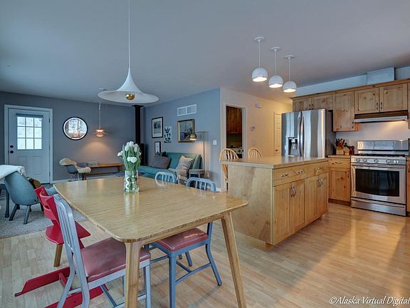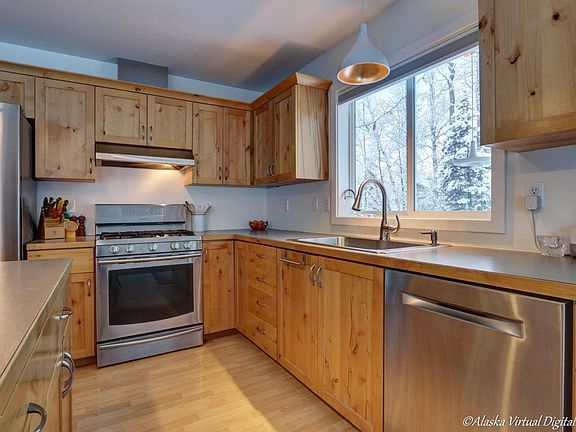 Listen to the sound of Wasilla creek out the window in this stylish custom home. The kitchen offers a large island SS Appliances, alder cabinets and a large patio door. Very private, large 1.66 ac. lot, 4 bedroom home with so many extras. Jotul gas fireplace, tiled laundry and bathrooms, custom handrail, custom trim, fenced yard, lots of natural light. You can enjoy this peaceful setting everyday.
