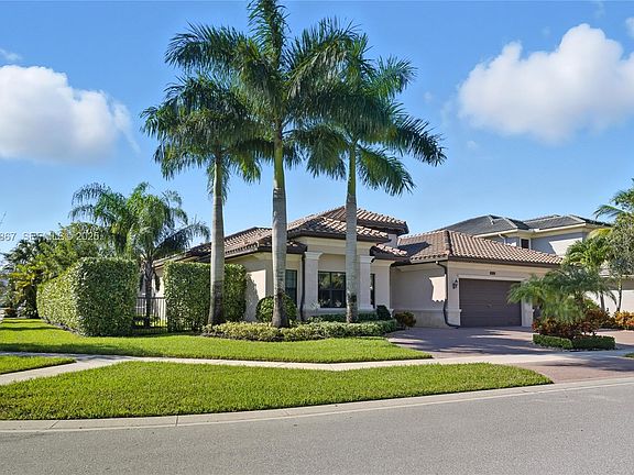 Beautiful Charleston Grande model in Seven Bridges! This one-story 5BR/5BA home offers nearly 4,000 sq. ft. on one of the largest corner lots, providing complete privacy with no homes or roads directly facing the property. Just a short walk to the 30,000 sq. ft. clubhouse. Features include a gourmet kitchen with high-end stainless steel gas appliances, formal dining room, wet bar, impact glass windows, spacious ensuite bedrooms, and a circular driveway. The primary suite boasts a coffered ceiling, dual walk-in closets, and a luxurious bathroom with dual sinks. Enjoy the screened saltwater pool with heater and outdoor kitchen. Additional upgrades include a whole-house generator, camera system, and full-home water filtration. Meticulously maintained and move-in ready—this home is a must-see!