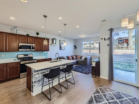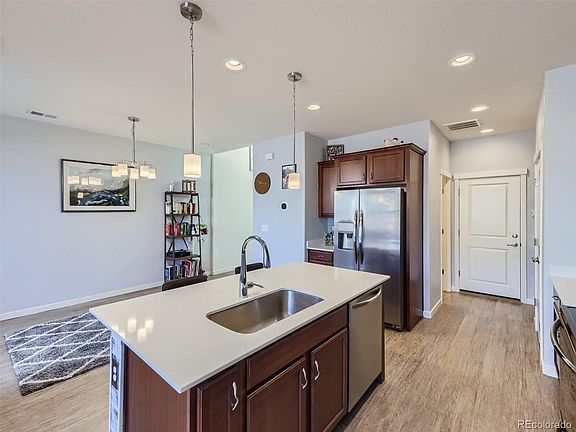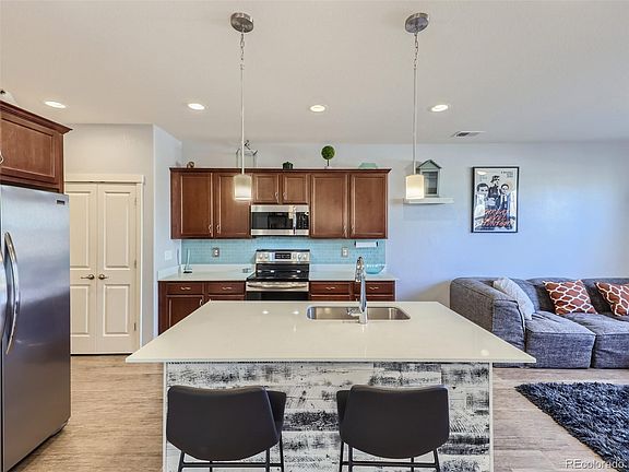 Welcome to 9773 Birch Ln, a stunning 2-bedroom, 2 1/2-bathroom townhome in Thornton, CO, that boasts an array of luxurious upgrades, making it feel like a model home. Built in 2020, this residence is a testament to modern living at its finest. Step inside to discover upgraded LVP flooring that flows seamlessly throughout the main living spaces, complemented by plush carpets and padding in the bedrooms. The kitchen is a chef's delight, featuring tall dark wood cabinets, high-end fixtures, Quartz countertops, and top-of-the-line stainless steel appliances. A large pantry and a stylish bar area make this kitchen both functional and aesthetically pleasing. Upgraded ceiling fans, light fixtures, and raised outlets for TVs provide the perfect finishing touches to this meticulously designed home. With a 1-car attached garage, convenience is at your fingertips. The HOA covers a range of amenities, including access to a clubhouse, fitness center, pool, hot tub, trash removal, snow removal, and common area maintenance, ensuring a carefree and enjoyable living experience. Backing up to walking trails and a canal, this property is situated in a prime location. This townhome is close to the light rail, offering easy access to transportation. Nearby, you'll find a variety of restaurants and grocery stores, providing the ultimate in convenience and entertainment. Don't miss the opportunity to make 9773 Birch Ln your dream home, where upgrades, style, and comfort come together seamlessly. Schedule your showing today and experience the epitome of modern townhome living!
