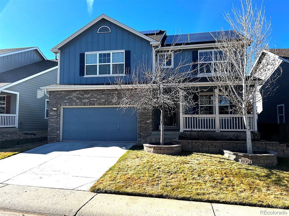 Wonderful Highlands Ranch home in a quiet neighborhood. A spacious kitchen with an eat in area features quartz counters, stainless appliances and lots of counter space. The open concept brings in the spacious family room with its vaulted ceiling, gas fireplace and tastefully finished hardwood floors. Out back is a great deck for entertaining and a nicely finished yard space complete with convenient, low maintenance, artificial turf. No mowing needed! Upstairs the primary suite includes a spacious 5 piece primary bath; a dual vanity and dual walk-in closets. Two good sized secondary bedrooms and a full bath complete the upper level. The large unfinished basement has plenty of storage space and is a perfect work out area. The installed, and paid for, Solar System reduces your electric costs. (Solar is paid for the entire lease period). This property is conveniently located a few minutes from Chatfield Reservoir and close to Highway 85. Several Parks & extensive trails are minutes from your doorstep. And to top it off, Town Center and Central Park with their fabulous restaurants are close by.