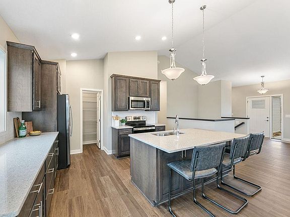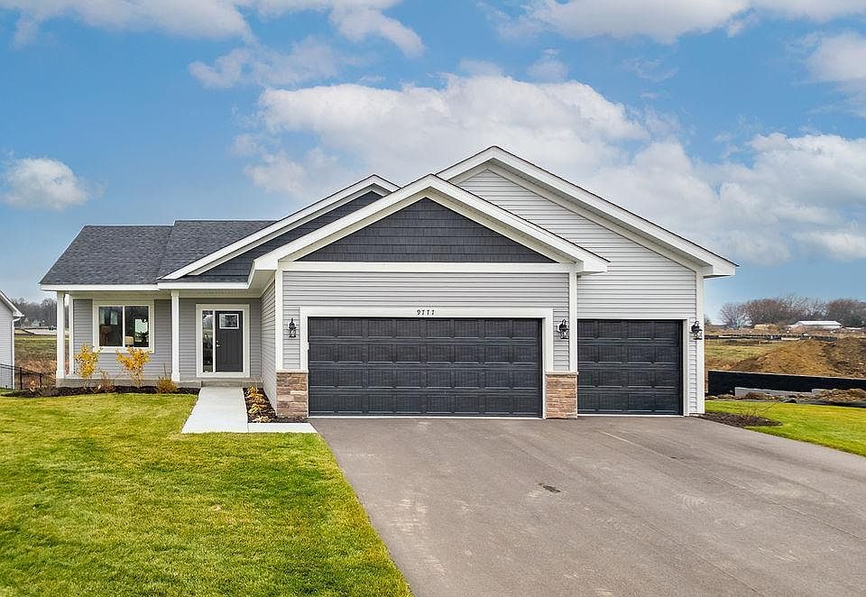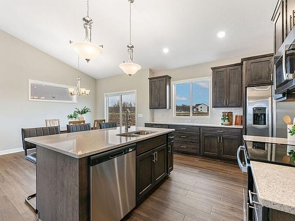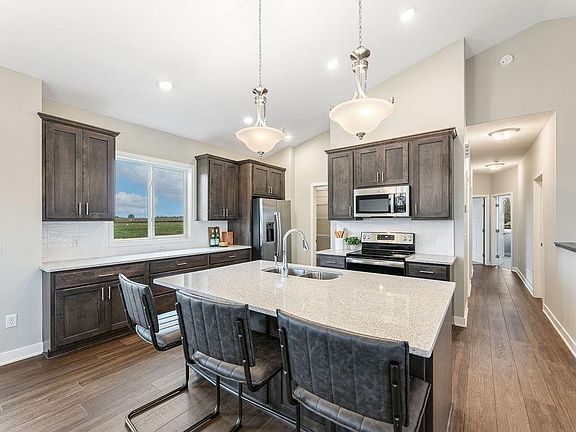 New construction with lots of upgraded features. This walk-out Rambler style home starts with a fully landscaped yard that includes in-ground sprinklers. As you pull into the driveway you'll notice the oversized 3 car garage that's extra deep for those longer vehicles or a work shop. The covered front porch, the exterior colors, as well as the textures and stone accents make this one pop! The main floor hosts 3 bedrooms including a private owners suite equipped with a walk-in closet, double vanity sinks, tray vaulted ceilings and lots of windows for natural light. As you enter there is a built in foyer sitting area complete with storage and jacket racks, the open floor concept allows lots of natural lighting compiled with the soaring vaulted ceiling its very roomy and impressive. In the kitchen there is a Granite center island, Granite counters, stainless steel appliances, center island mounted sink, walk-in pantry and lots of cupboard space. Other notable amenities are main floor laundry, generous amount of windows and transoms, full basement ready for finishing, deck ready, maintenance free siding & windows, and architectural style roofing. Don't forget the huge open/usable yard that backs to a pond, the views are awesome!