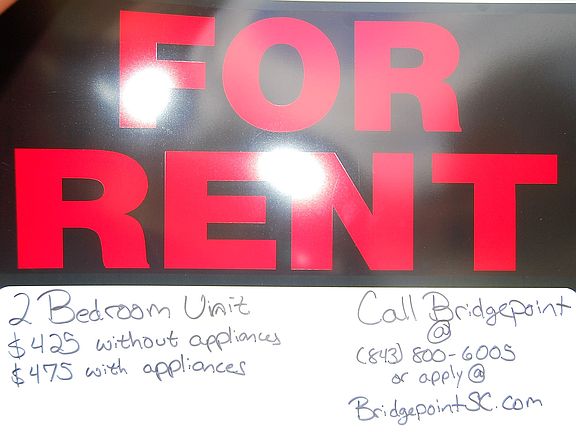 This affordable 2 bedroom townhouse has just been freshened up with paint, flooring, and a brand new screen door. These units are designed to give you the most space for your money. The upstairs has 2 spacious bedrooms and a full bathroom. Downstairs there is a very large living room and an ample kitchen. The unit can come with or without appliances. $425 without appliances and $475 with appliances. Call Bridgepoint Property Management now to inquire or apply (843) 800-6005.