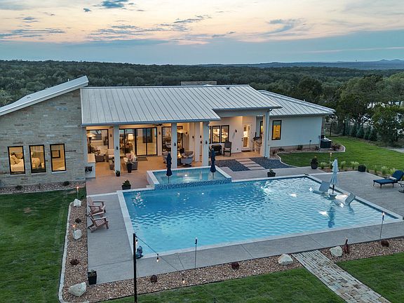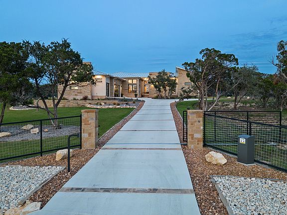 Making an immediate impression with its modern hill country design, fully fenced remote stone entry, and lush landscaping, this property is truly special. Welcome to custom luxury in the coveted Alto Lago private section of the Cordova community on Canyon Lake. Everything you could dream of exists on this modern oasis property featuring a 3684 sqft single-story custom home situated on an exquisite 1.52-acre property. Elegant landscaping leads you towards the 4 bed 4.5 bath home with a car enthusiast's dream garage. Open-concept living, with stunning picture windows throughout, provides amazing natural light highlighting high-end custom finishes. Designer Tile frames the electric LED fireplace centered in the great room opposite the gourmet kitchen with a spacious waterfall island and stunning soft-close cabinetry. Allow the entertainment space to expand from the living room onto the covered patio overlooking the stylish backyard of your dreams. Take a dip in the resort-style pool and spa while you enjoy meals prepared in your full outdoor kitchen with surround sound. Experience the starry skies while warming up next to your custom-built fire pit surrounded by custom exterior party lighting. Enjoy heightened productivity in the natural light-filled office with designer backsplash and sophisticated built-ins. An immaculate layout allows for gentle flow and privacy for everyone. All bedrooms boast ensuite baths, spacious closets, and custom window shades. The stunning primary suite provides privacy and elegance with soaring ceilings, natural light, custom blackout shades, and direct access to your outdoor living space. Step into your serene spa-inspired bathroom with a marble-tiled shower room with an enclosed soaking tub, gorgeous floating vanities with detailed lighting, and custom closet space. Fully approved plans by the HOA for a 1,000+ sqft casita for this home, just ready for the new owner. This property is truly one of a kind and designed to enhance the hill country surroundings while enclosing you in personal luxury.