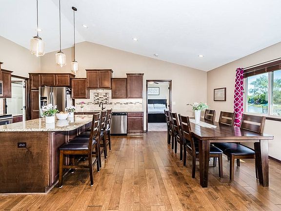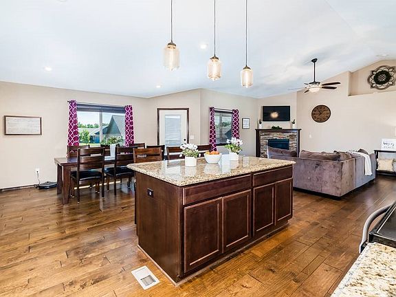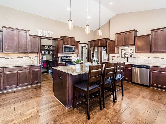 Welcome home to this absolutely stunning 5bed/3bath/3car Mulvane ranch with pond view. This zero entry home features one of the most open floor plans we've ever seen, this one has all the bells and whistles - paneled doors, bull-nose corners, modern lighting and hardware, and so much space! As you enter this home, you'll notice the gorgeous wood floors, stone-faced gas fireplace, high vaulted ceilings, and the wonderful flow between the living room, dining area, and kitchen. The kitchen itself boasts an extensive center island, granite counter tops, HUGE walk-in pantry, stainless steel appliances, and coffee bar area. The master is spacious and bright with a view of the pond to the rear, and offers an en suite bath with granite-topped dual vanities, extra large elegantly-tiled walk-in shower, separate tub, and substantial walk-in closet with entrance to the main floor laundry. Both additional main floor bedrooms are over-sized, and the full hall bath is modern and fresh. In the view-out basement, you'll find a sizable family/rec room with upgraded Stainmaster carpet and pad. Adjacent to this room is a second kitchen/wet bar with a full set of appliances, beautiful acid-washed floors, and pass-through bar. A generously-sized bathroom boasts one of the largest tiled showers we've ever seen. This level is rounded out with two additional bedrooms, dedicated storage area, and mechanical room. Outside, you'll find an enormous partially-covered deck, custom stained patio/fire pit area, lush green lawn with sprinkler system, low-maintenance landscaping, and proximity to the walking path and pond. This home sits in a quiet neighborhood close to the highway, groceries, and gas. Give us a call before it's gone! **See the 3D tour and the professional videography of this home for additional views.**