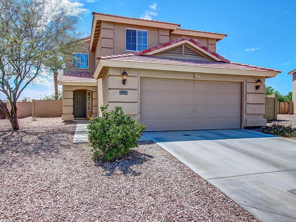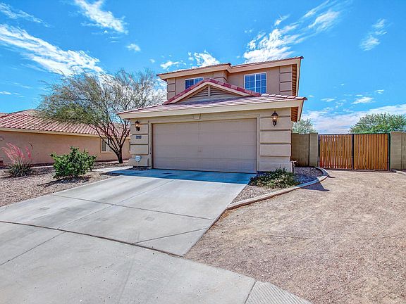 Beautiful two story Solar home on 12th fairway in Buckeye! Welcoming color palette flowing throughout. Kitchen is complete with a plethora of cabinets including custom matching pantry added, black appliances, and breakfast bar. Bedroom and full bathroom downstairs. Laundry has extra cabinets added as does the garage not to mention the huge workbench. Step from the loft to the balcony overlooking the Sundance golf course and image the sunsets you will see or just relax and take in the view of the nearby White Tank Mountains. Master suite has plush carpet with ceiling fan and picture window. Full bathroom with dual sink vanity and private toilet room. Spacious walk in closet! Backyard features a covered patio with simulated Flagstone and firepit, sparkling fenced pool with rock waterfall. AC units have moved and walled to create a fantastic entertaining area. Block walls were added on both sides to create separate storage area on well sized yard. There's also a leased solar system to help offset those summer cooling bills. Come see it all before it's gone.
