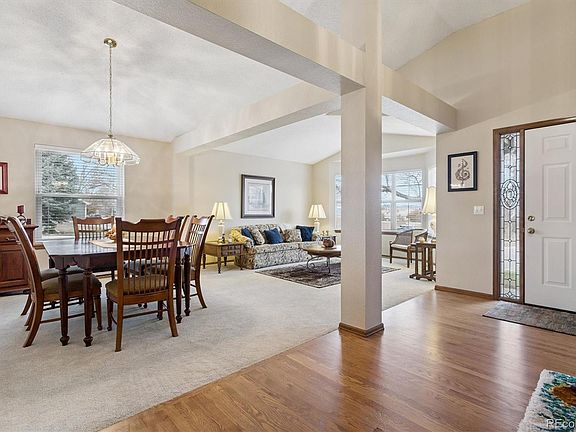 WELCOME TO A BEAUTIFULLY MAINTAINED RANCH STYLE HOME IN HIGHLANDS RANCH ON A DESIRABLE CORNER LOT ~ RARE MAIN FLOOR PRIMARY SUITE! This move-in ready home features an open concept floor plan with tall/vaulted ceilings, custom wood flooring w/ cherry inlay, double pane windows & 6-panel doors. As you step inside there is a tall foyer, ample living room with bay window & formal dining room perfect for hosting guests. The sunny eat-in kitchen has a nice window & overhead skylight, newer Stainless appliances, pantry & ample cabinet space. Adjacent is the wonderful family room boasting a 2-sided gas fireplace, built-in shelves; from here step out to the backyard & patio. You'll love the main floor primary suite providing convenience & comfort with its tastefully appointed 5-pc bath featuring heated floors, granite dual vanity, walk-in closet. Two additional bedrooms complete the main level (one currently used as study), along with full bath & laundry. The finished basement offers flexible living space to meet your needs--rec / entertainment / workout area--plus perfect guest quarters with a bedroom & 3/4 bath. You have plenty of storage, both under-stair & crawl space for seasonal items & decorations. Enjoy Colorado living at its best in the private fenced backyard with mature trees & stamped concrete patio ideal for outdoor dining. The yard is low-maintenance fitted with rock & bushes at the perimeter; mature Ash trees grace the front yard. Improvements of note: Fresh exterior paint 2025, new furnace 2022 / AC 2020, Maytag stove, KitchenAid refrigerator 2025. Enjoy a convenient location just one mile to Westridge Rec Center & King Soopers, close to walking paths, parks & top-rated Douglas County schools. HOA fees include access to all 4 HRCA rec centers, and the new Highlands Ranch Metro District Senior Center offers classes & events. Make this outstanding home yours!