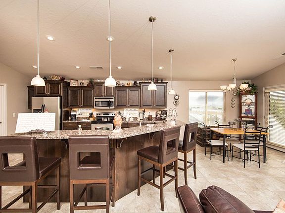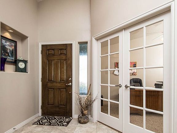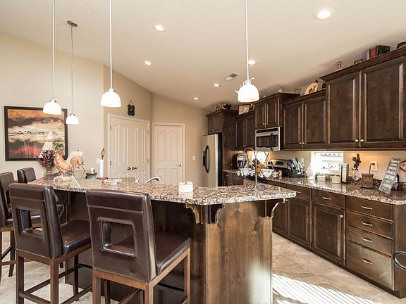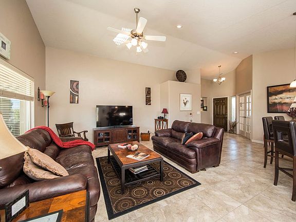 This Ence Five Star Energy home features an open floor plan with vaulted ceilings. Kitchen has granite counter tops, knotty alder cabinets, under counter lighting, pull out shelves and large pantry. Master bathroom includes a garden tub and walk in shower, dual sinks and walk in closet. The master bedroom has access to covered patio. French doors from dining room lead to a beautiful large outdoor oasis in the backyard with views of the Virgin Mountains and the valley,water feature with a stream, raised rose garden and large covered patio. Home has extra long driveway for additional parking. Agent is related to Seller.