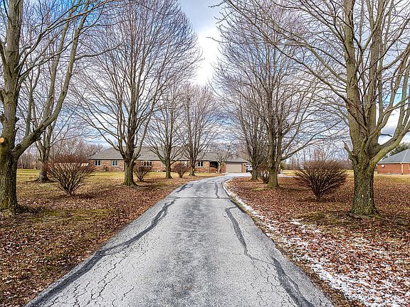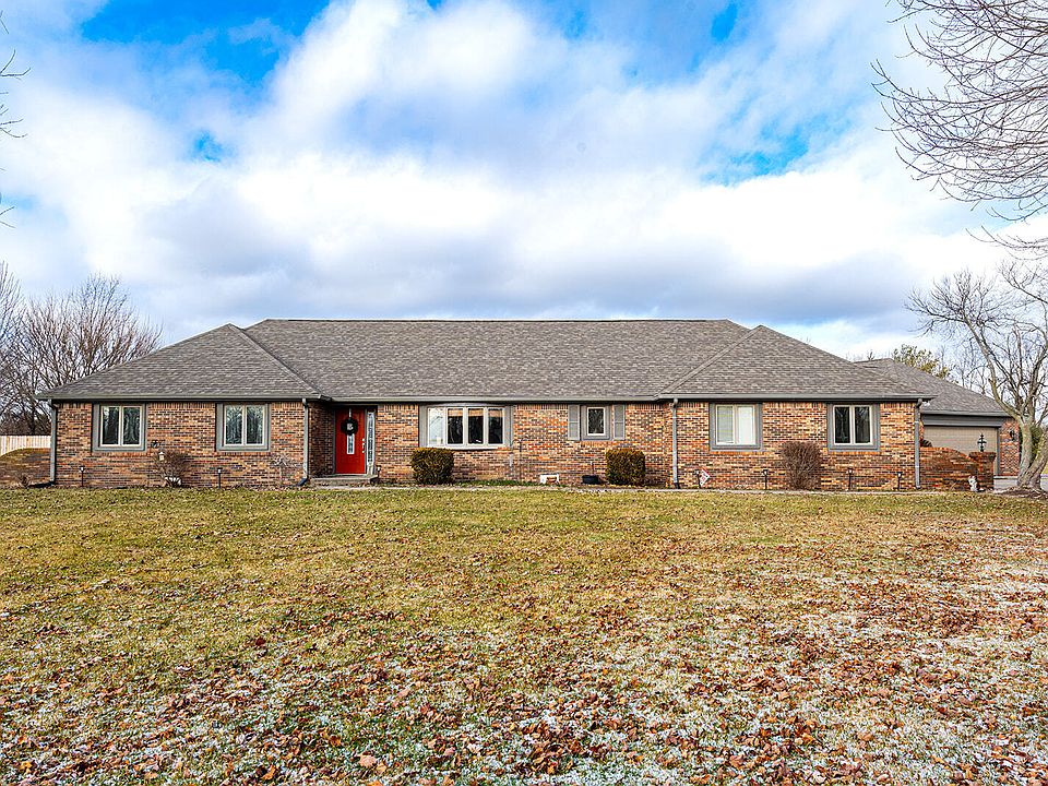 Wanting some acreage with location + outbuilding+ fence + inground pool + 4 bedrooms... Here we go! All brick wrap ranch home with many updates including new roof2023 , pumped septic 2024, HVAC, Garage Door2024 , Sump pump2023, new privacy and acreage fenced2021, new dishwasher/grbg disp 2022 & updated kitchen with granite. This stunning property has a primary suite with 2 closets and rear exit onto a private patio. Primary bath is dual sinks, + garden tub + full stall walk in shower. The kitchen is offering updates that include pull out shelving, built in spice rack, a place for all the pots & pans. Breakfast eating granite counter as well as the perfect place to plug in all the crockpots for a Superbowl Party! Vaulted Great Room opens the place up and the electric insert fireplace brings the feeling of home. The East side of home could be used as an in-law quarter and even has a place for a kitchenette to be added if wanted. Alternative could be great for a guest area as it has its own private entrance. NO HOA on this fully fenced in 2.98ac property. Salt Water in ground pool has new liner in 2019. Outbuilding is 220 V sep meter with heat and garage door w/ opener (concrete floor + block walls+ 12 ft ceiling w/ fans + loft). Property has tree line + Horse shoes & firepit for Fun and games.East side Attic (via scuttle) has a plywood floored 700 sq ft storage area above.