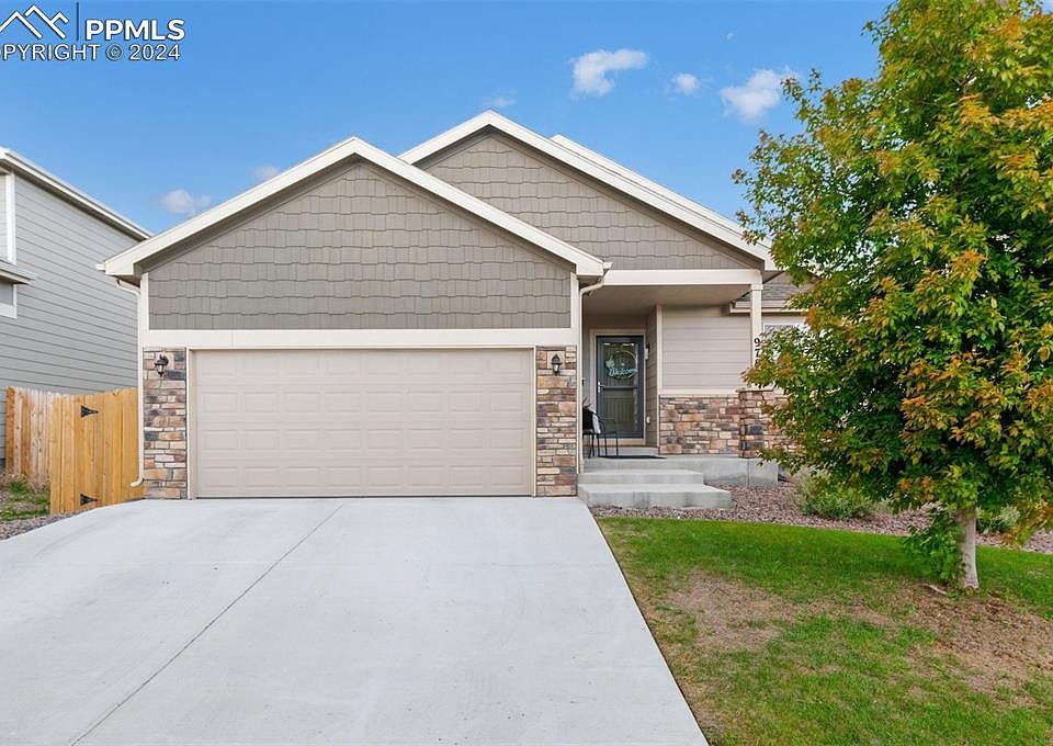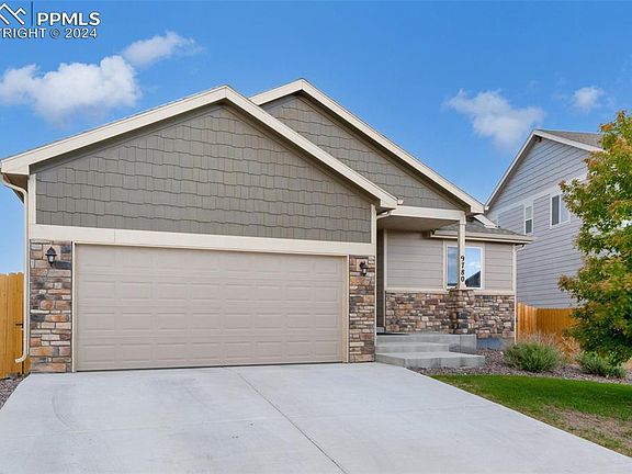 Welcome to this beautifully maintained ranch home located in the highly desirable Lorson Ranch community. Nestled in the quietest corner of the neighborhood, this residence offers a serene and community-oriented atmosphere, perfect for those seeking a peaceful yet connected lifestyle. Convenience is at your doorstep with a bus stop right in front of the house. Step onto the charming covered front porch, a perfect spot to enjoy your morning coffee or evening sunsets. Inside, you'll find an inviting open living space where the living room, kitchen, and dining nook flow seamlessly together, creating an ideal setting for entertaining or everyday living. The kitchen is a chef's dream, featuring ample espresso wood cabinetry, sleek quartz countertops, modern stainless steel appliances, a pantry, and a large center island with eat-in seating. From the dining area, open the sliding door to the backyard where new Trek steps lead to an extended patio, perfect for easy outdoor dining and relaxation. Enjoy breathtaking mountain and meadow views with no neighbors behind, providing a private and tranquil outdoor retreat. The main level hosts two bedrooms situated on opposite ends of the home for added privacy. The primary bedroom boasts a luxurious 5-piece en-suite bathroom. The basement offers two additional bedrooms, perfect for guests, along with a large family room and generous storage space. The 2-car attached garage features a newer storage loft and a collapsible workbench, offering plenty of space for tools and projects. Additional updates include a new storm door, enhancing the home's functionality and appeal. Located in a prime spot with easy access to common thoroughfares, Fort Carson, Peterson AFB, and Colorado Springs Airport, this move-in-ready gem is ready to welcome you home.