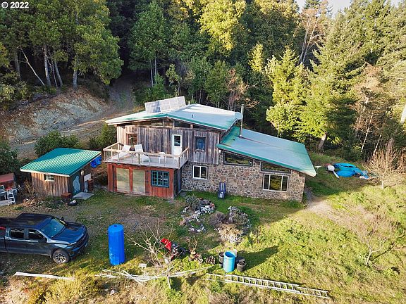 Enjoy an off the grid home on 76 Acre. Rustic post & beam, stick-frame craftsman home w/ open concept and plenty of natural light. Cozy up by the fireplace featuring raw stone accent wall. Live-edge wood staircase to bedrooms upstairs. Owners bed features vaulted ceilings and bath. South facing property provides breathtaking views of the valley below. Elk, bear and deer are regularly present. Great for hunting, wilderness survival camp or preppers. 30 min from Gold Beach! Owner carry an option.