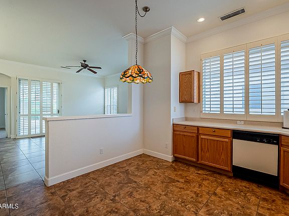 Desirable 55+ Adult Community features this updated and delightful residence, ready for immediate occupancy, presents a 2-bedroom, 2-bathroom treasure. Modern conveniences abound, from the central vacuum system to the upgraded AC and garage door installed in 2019. Luxurious details like plantation shutters, crown molding, illuminated plant shelving, and tile flooring grace the open floor plan, while new 2023 carpets add plush comfort. The kitchen boasts appliances, ceiling fans throughout, and fresh 2023 paint brightens up the interior. A 2021 gas oven/range awaits culinary creations. The indoor laundry area includes a washer and dryer for your convenience. The private backyard connects to the New River wash. Conveniently situated near Loop 101 & the Westgate E