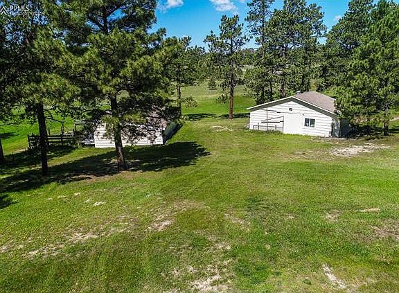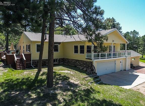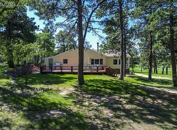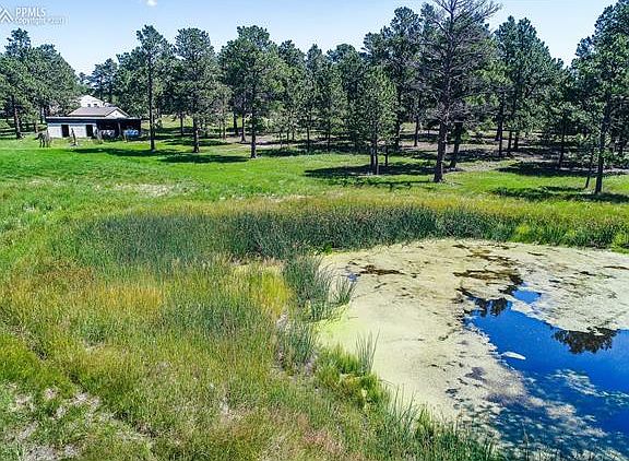 BACK ON THE MARKET!! Sought after southern Black Forest location! Remodeled rancher on 5 treed & meadow acres with a spring fed pond!! The home is bright and welcoming w/ 2,400 square feet on the main level! Spacious great room w/ tons of windows, new carpet, new wood floors, walk-out to composite deck, wood stove with granite and wood surround. 48x20 barn featuring 4 stalls w/ runs, water and electric. 24x36 finished and insulated workshop w/ radiant heat, water, dust filtration system and tons of electric. 13x26 carport. Zoned for horses!! The kitchen has glowing wood floors, stainless steel appliances, gas stove and a pantry. Spacious main level master suite with sitting area, walk-in closet, abundance of windows, tongue and grove wood vaulted ceilings, walk-out to private wrap-around deck, 4-piece master bath with wood floors, custom wormy maple vanity with granite counter, separate shower and a jetted tub. Low maintenance exterior with vinyl siding, stacked stone, composite decking and snow melt cables. There are four main level bedrooms (three of the bedrooms have very large walk-in closets) and a large 4-piece bath w/ tub and a separate shower. The grounds are park like, fenced and mitigated - lush green meadow and a spring fed pond, fenced yard or garden area with gardening beds and a drip line. Main level laundry with additional cabinetry and utility sink. All paved roads to the property. Partially finished basement with large work-out/office/family room area, remodeled 3/4 bath w/ tumbled marble and stone surround, custom built-in cabinetry, stained concrete floor and recessed lighting. No HOA or covenants.