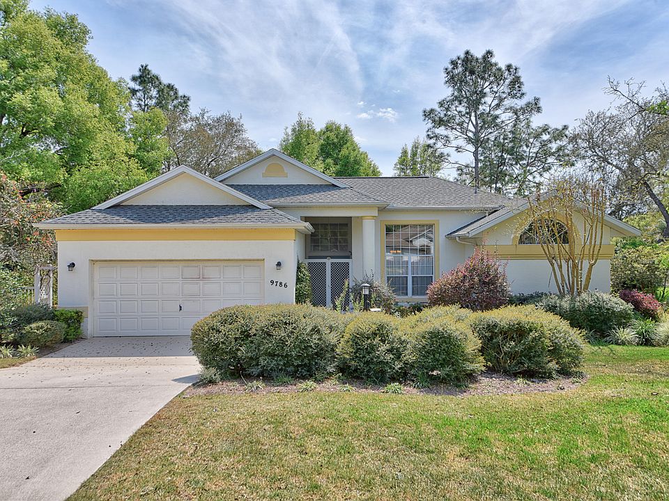 The volume ceilings are an impressive feature of this home. A newly installed roof is a plus in this three bd./ 2 ba. home with covered enclosed lanai, opening to a lovely paver patio. The kitchen was updated with granite counters and custom cabinets with build in slide out shelves for convenience. Appliances new in 2014. The split plan gives privacy for company. A spacious master bath has by pass hot water for quick service and jetted tub. An open family room and kitchen is enhanced by a separate Living room. Nature lovers will enjoy the Florida room opening to the patio. For amenities there is a residents park on the Rainbow River for swimming, picnic areas, kayak launch. Community Center offers cards, billiards, work out room, bar/grill, dining, pool, pickelball, tennis, disc golf etc
