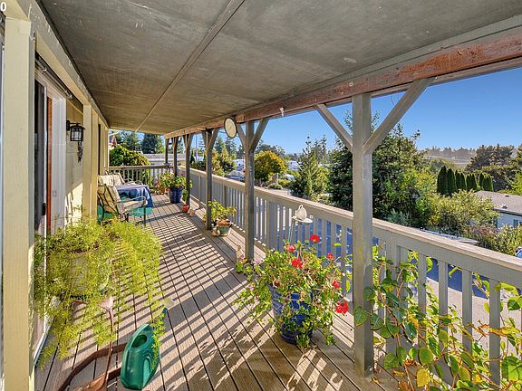 Bright and Spacious, well laid-out home in quiet neighborhood with big deck to relax on and take in the ocean view. Large living room has lots of natural light, vaulted ceilings, a wood burning fireplace for cozy evenings. Open kitchen has upgraded appliances, tile floors, slider from dining area to deck. Beautiful landscaping, easy maintenance. Convenient 18x30 RV Garage and carport. Charming back yard has covered patio, room to grow vegetables, hot tub. Many improvements. Excellent location.