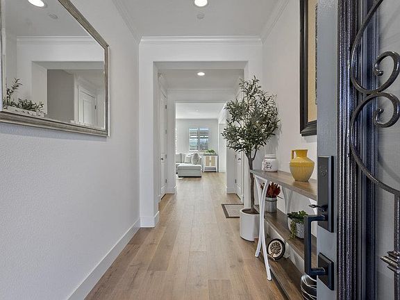 Looking for in a new construction home? 979 Pismo Court is a Capitola floor plan from Anderson Homes in Santana Ranch. The 4 bedroom, 3 full bathroom plus a loft home is available for a Hollister homebuyer. Beautiful southern light warms the great room, along with the fireplace. The kitchen has white cabinets and neutral countertops, upgraded backsplash, a large island, stainless steel appliances, soft closed doors, breakfast bar, and eat in kitchen area. The laundry room has the upgraded sink and white cabinets. The downstairs level has a full bathroom and bedroom. Continuous hardwood flooring throughout downstairs with high ceilings and crown molding. Upstairs the loft has an extra area for a study or office. The owner bedroom has an in-suite that is great for a sitting area with crown molding. The owner bath is grand with shower stall, sunken tub, double sinks, linen closet, and large walk-in closet. Carpet flooring in the upstairs bedrooms to keep you cozy. The home is equipped with solar panels owned, insulated attic and exterior walls, dual pane windows, low flow fixtures, dual zone HVAC, tankless water heater, and finished garage. The backyard has a stamped patio and side yard with a gazebo. The oversized side yard may fit your recreation toys.