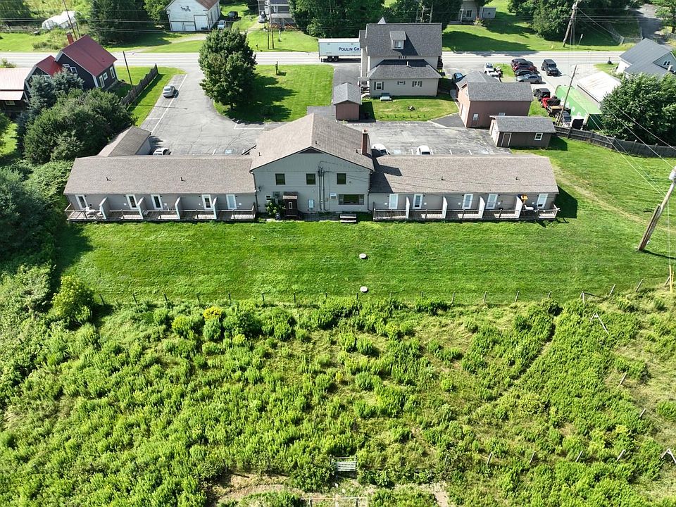 Investor opportunity just 8 miles from Jay Peak Resort! This well-maintained, updated property on 2.2 acres offers strong income potential with a flexible layout. The main level features ten 55+ efficiency units, each with a kitchenette, full bath, and private deck. A spacious 2-bedroom unit with an open-concept living area is perfect for an owner-occupant or on-site manager. Shared amenities include a large common room with brick fireplace, sunroom, commercial kitchen, laundry area, and storage. Additional buildings include a single bay detached garages and a large barn. Paved parking with EV charger in front; mountain views and pasture out back. Recent upgrades: 2020 boiler, improved sprinkler system, and electrical updates. Income figures listed are projected. With potential (may require zoning approval) for uses like staff housing, wellness retreat, spa, short term rentals, assisted living or traditional rentals, this property is a versatile asset in the heart of Vermont’s Northeast Kingdom.