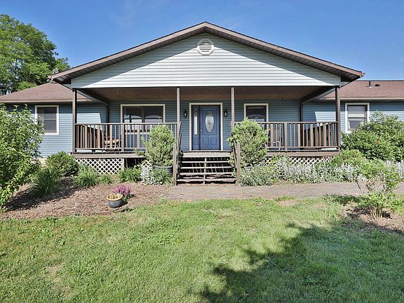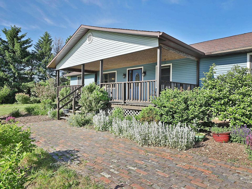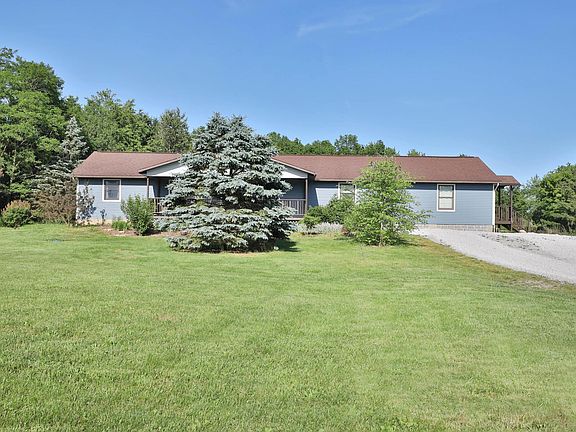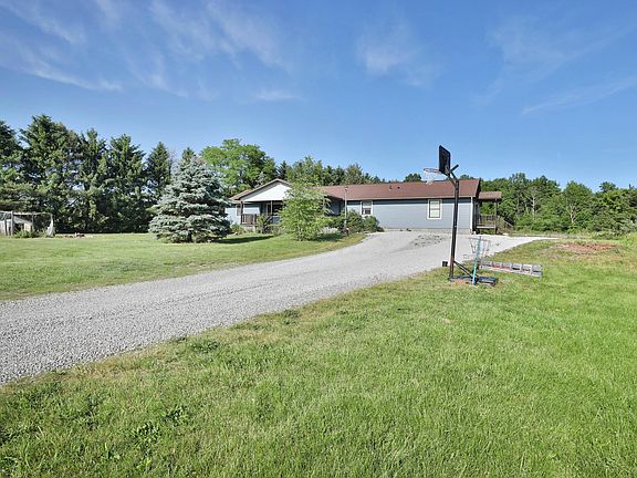 Beautifully updated ranch home situated on 5+ country acres, gorgeous setting privately situated back off the road. This home has a sprawling floor plan with 4 bedrooms, and 3 full baths, huge living room with fireplace and hardwood floors, beautifully updated kitchen with new subway tile back splash, and adjoining dining areas. Enjoy sitting on the over sized front covered porch. this home boasts a large/tall lower level with tons of potential. A detached pole barn in the approximately 3 plus acres of fenced pasture, numerous updates throughout. This impressive home and setting, a must see for $299,999.