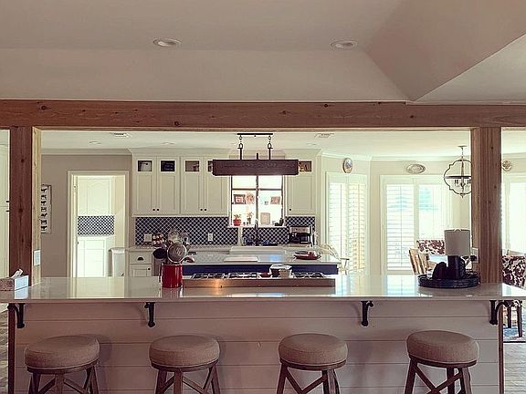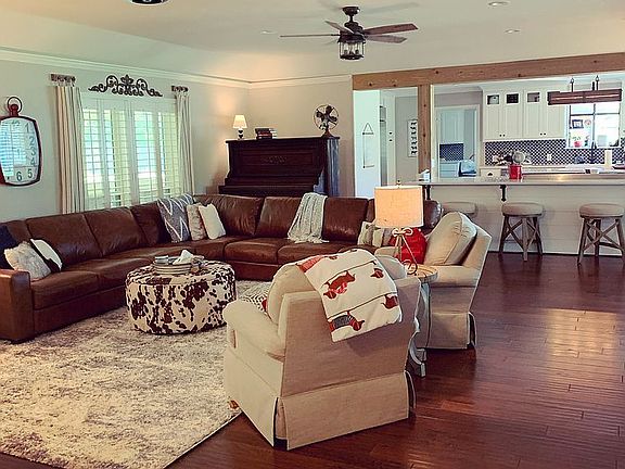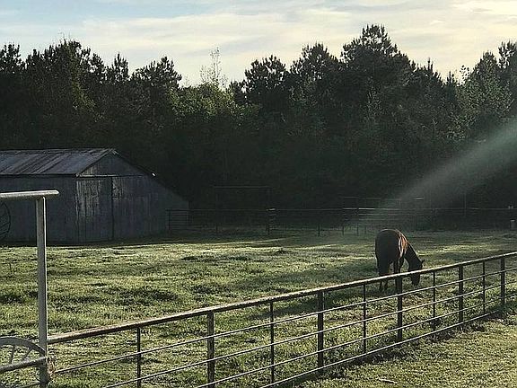 Handscraped wood floors in liv area and hall Recessed lighting. New carpet in all bedrooms 2021. Kitchen remodeled in 2020 with custom cabinets, commercial range, built in professional stainless fridge, travertine tile. Liv room has wood burning stove with brick surround and mantle. Shiplap on walls around fireplace, recessed lighting, and two ceiling fans. Mast bath remodeled 2021 with sep shower, 2 closets, freestanding tub, custom vanity, travertine tile. Sunroom has built in desk and shelving used as home office. Screened in back patio and in ground pool and hot tub. Land is picturesque with a large pond, pipe fence&crossed fenced. Barn,corral,chutes,well, city water, entry gate.